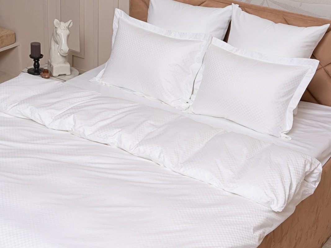Простыня классическая, наволочки "оксфордские" с ушками на запахе (50x70), наволочки классические без декоративных элементов на запахе (70x70), пододеяльник с потайной молнией.