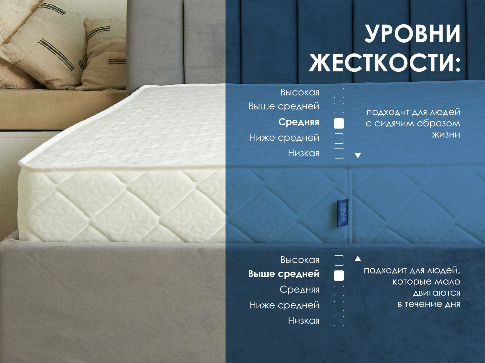 Димакс Relmas Various S1000 – двусторонний ортопедический матрас с разной жёсткостью сторон: средней и выше среднего. Модель сочетает в себе ортопедические свойства и массажный эффект, который помогает расслабить мышцы и улучшить кровообращение во время сна.