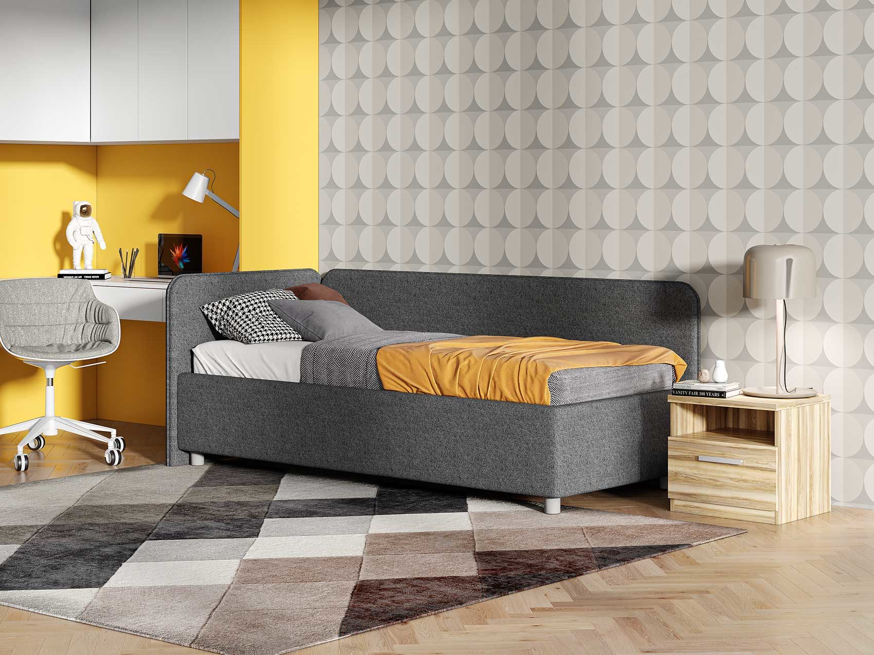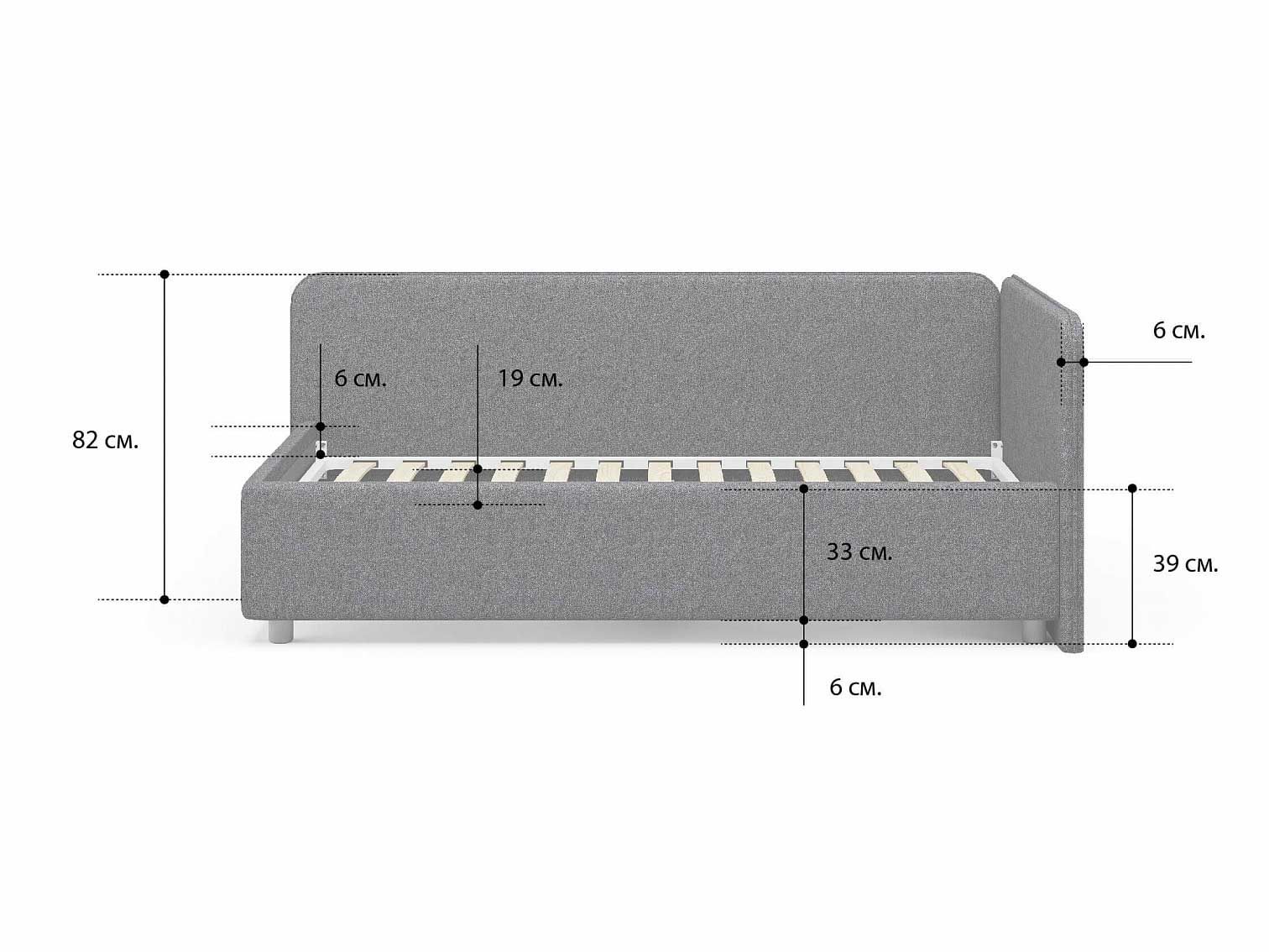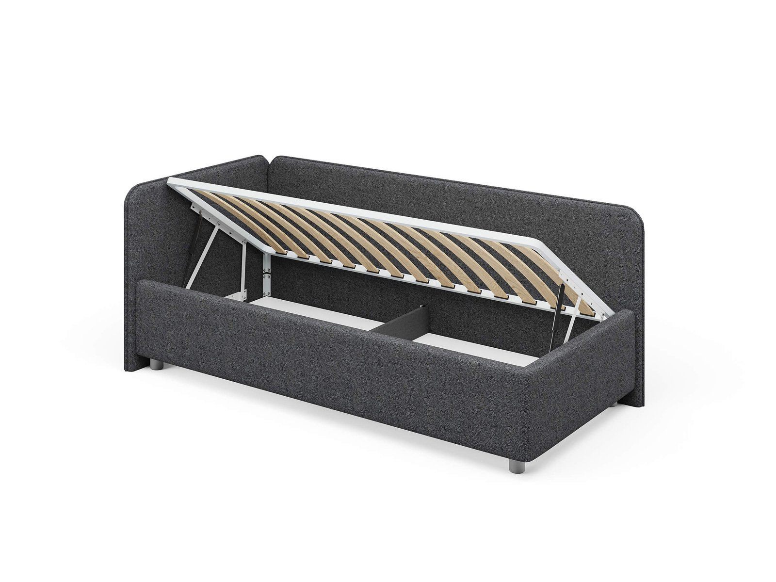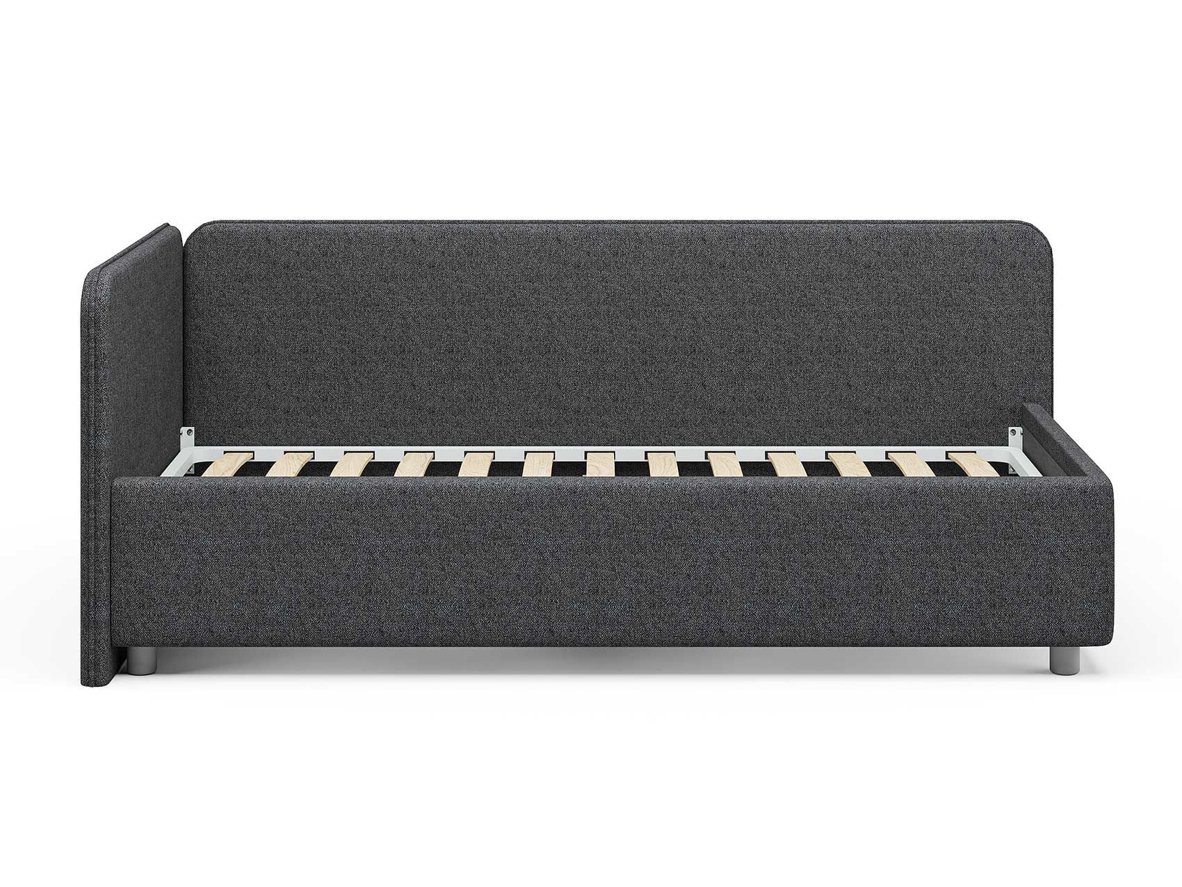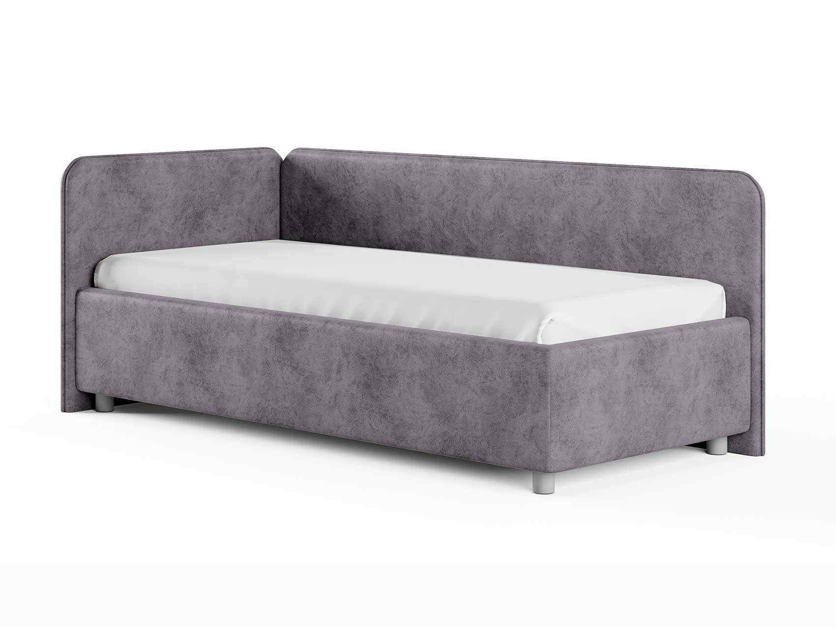 Односпальная кровать в современном стиле. Кровать-софа с одной боковой спинкой. Идеально подходит для квартир с небольшой площадью, детских и подростковых спален, гостевых комнат. Боковую спинку кровати можно изготовить на выбор на правую или левую сторону. Модель изготовлена из ДСП.