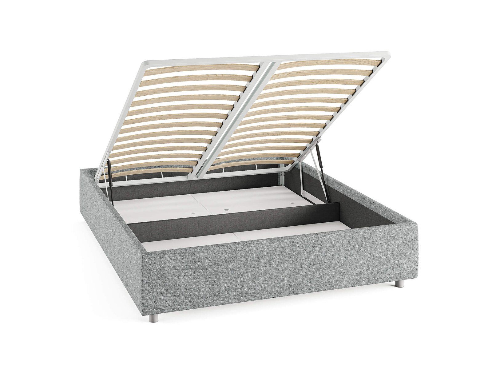 Кровать комплектуется металлическим основанием и подъемным механизмом со вместительным бельевым ящиком. Дно бельевого ящика легко сдвигается для обеспечения уборки под кроватью.
