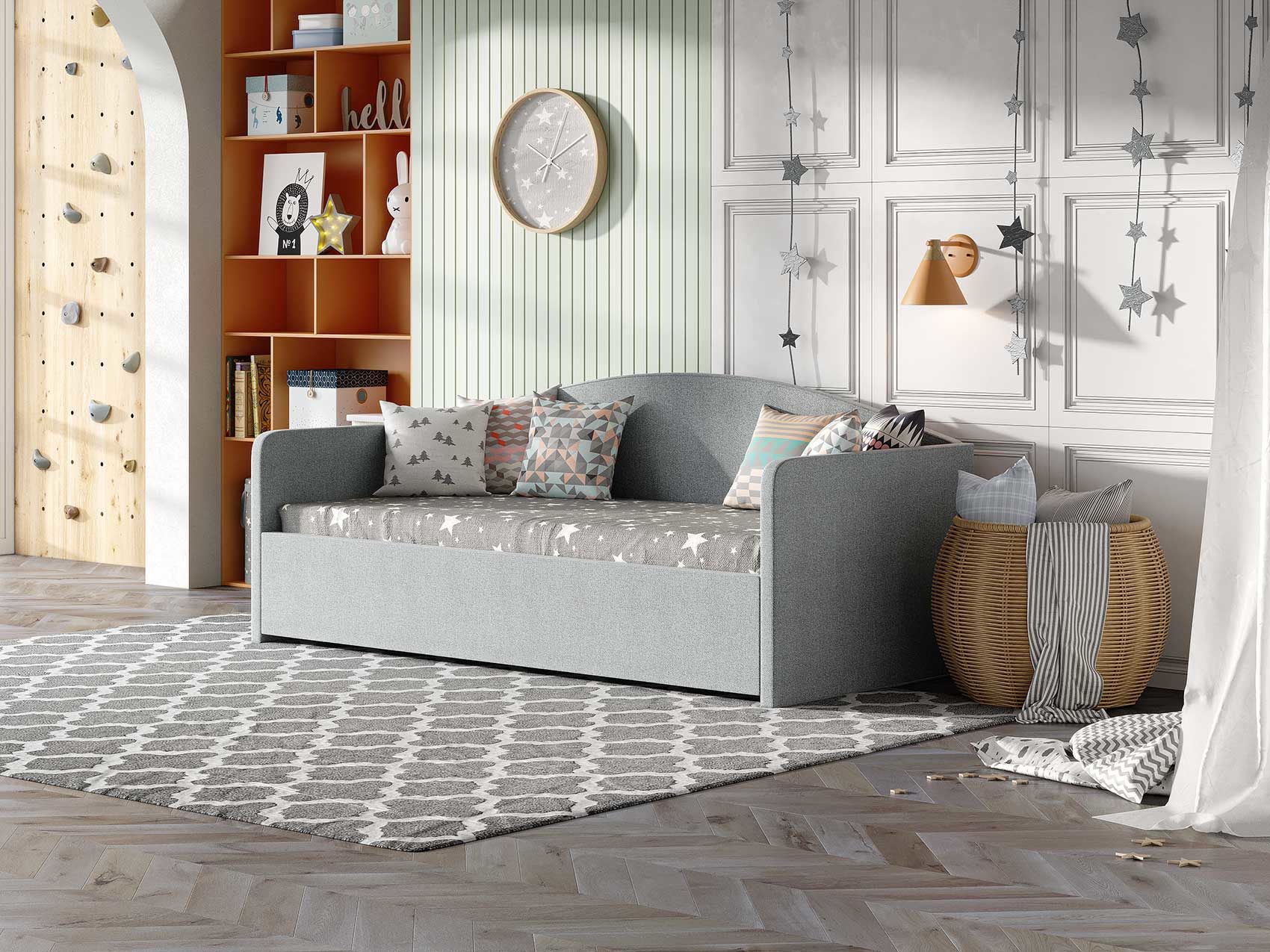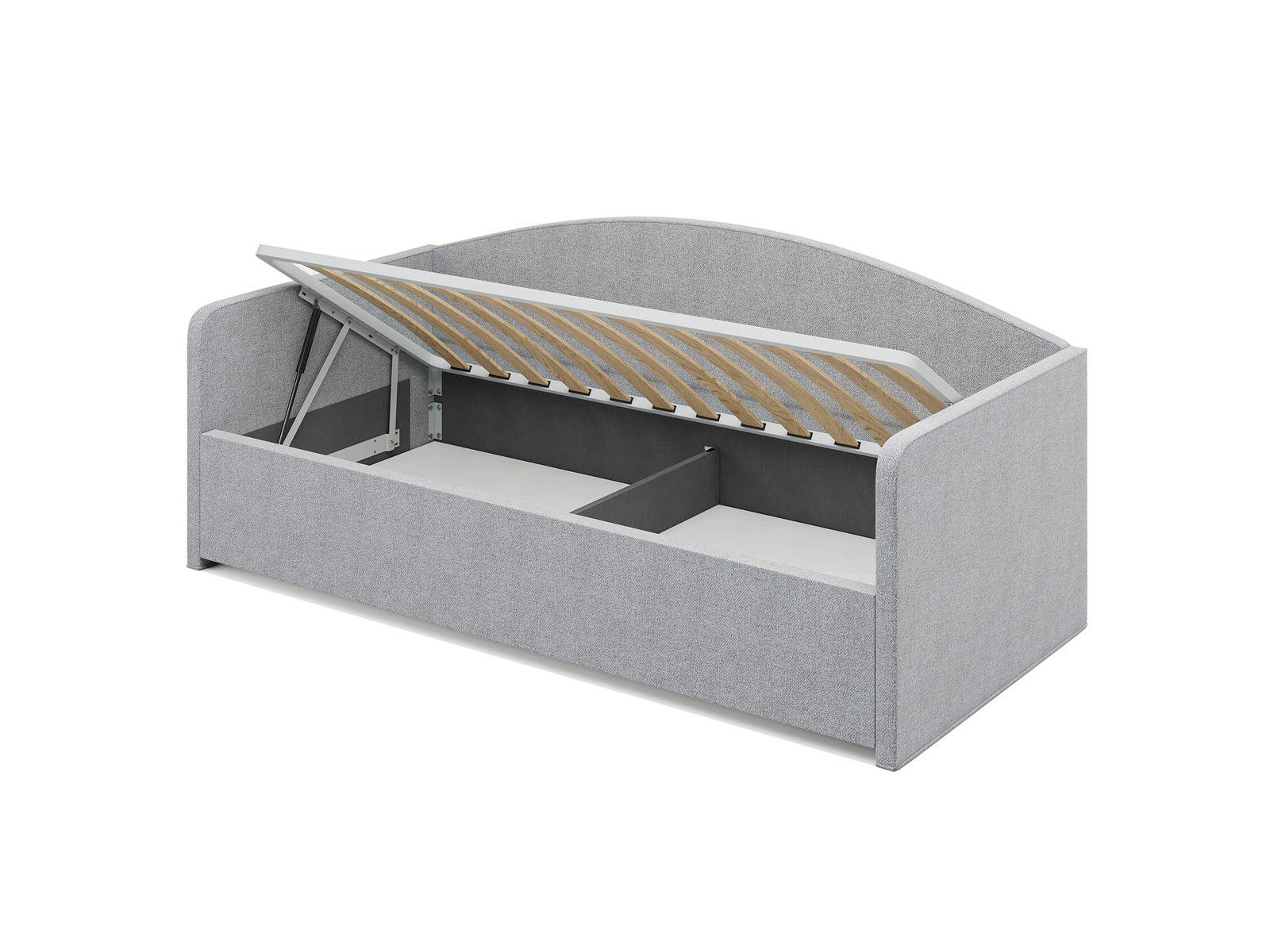 Кровать комплектуется металлическим основанием и подъемным механизмом со вместительным бельевым ящиком. Дно бельевого ящика легко сдвигается для обеспечения уборки под кроватью.