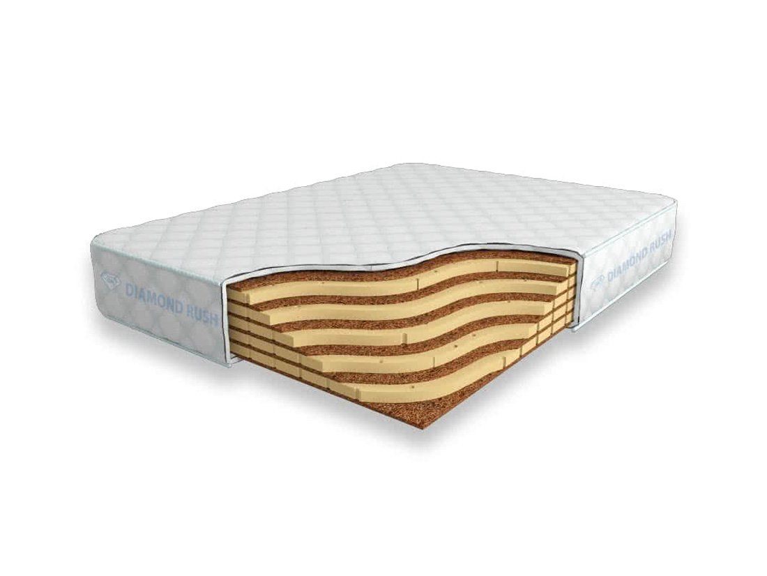 Матрас Diamond Rush Mono Mix Cocos 21 DR является беспружинным, т.е. не имеет в своей основе пружинного блока. В его состав входят одно или несколько чередований слоев латексированной кокосовой койры (1см) и натурального латекса с перфорацией (3см). Такая модель матраса относится к среднежестким и обладает ортопедическим эффектом.