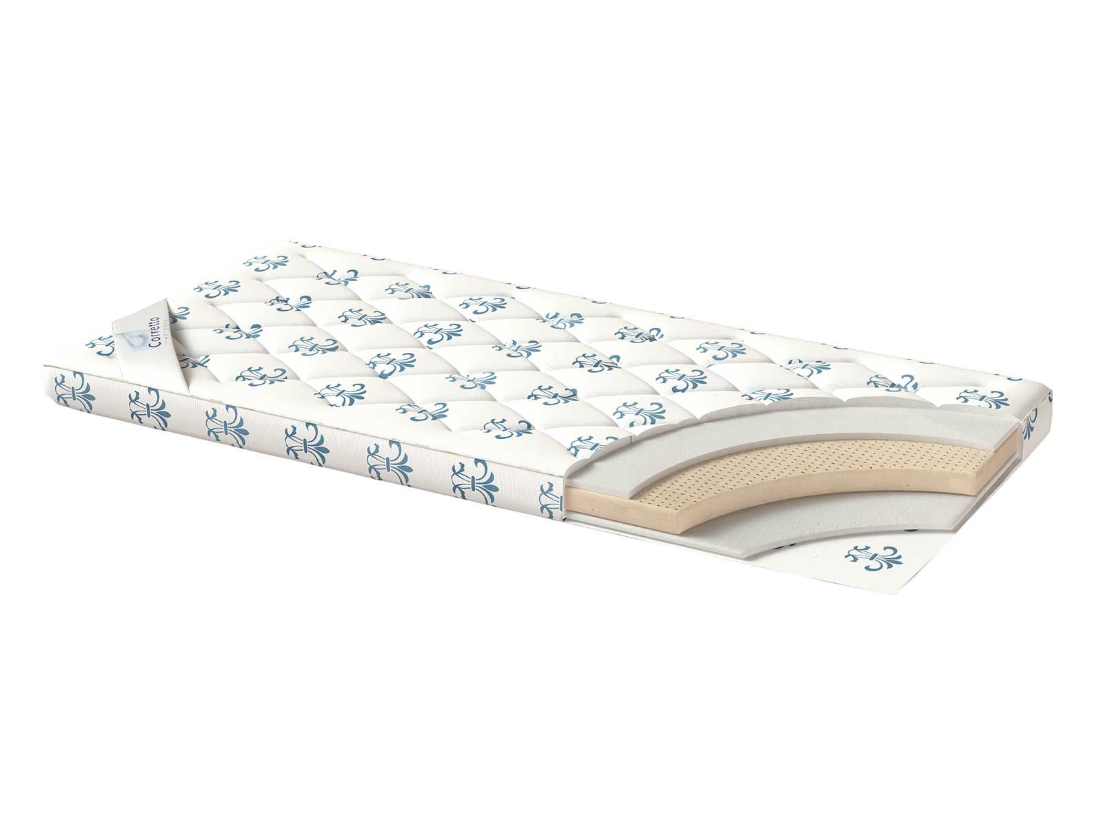 Внутри изделие имеет плиту из натурального латекса высотой 2 см. Плиту наматрасника укрывает простеганный чехол, он выполняется из хлопкового жаккарда класса "Люкс" (70% х/б, 30% п/э). Небольшое количество полиэстера придает чехлу прочность и износоустойчивость, но не уменьшает "дышащие" способности хлопка.