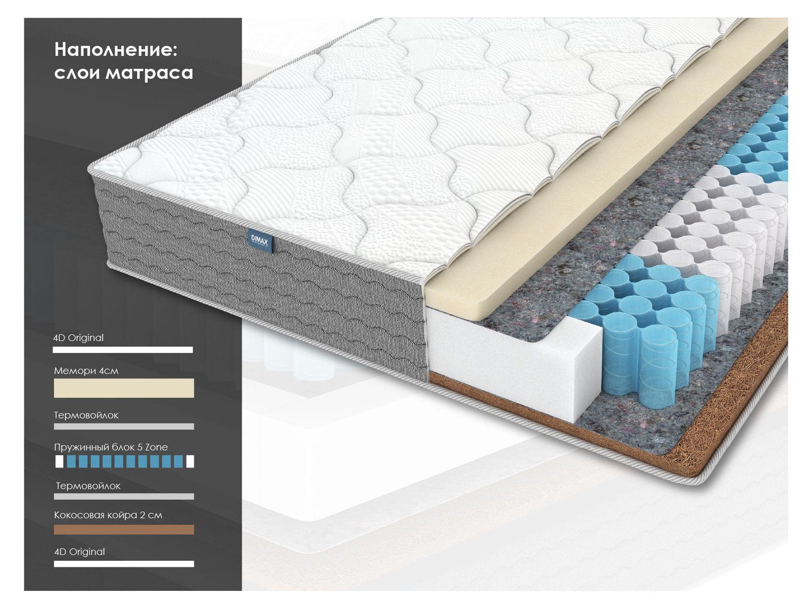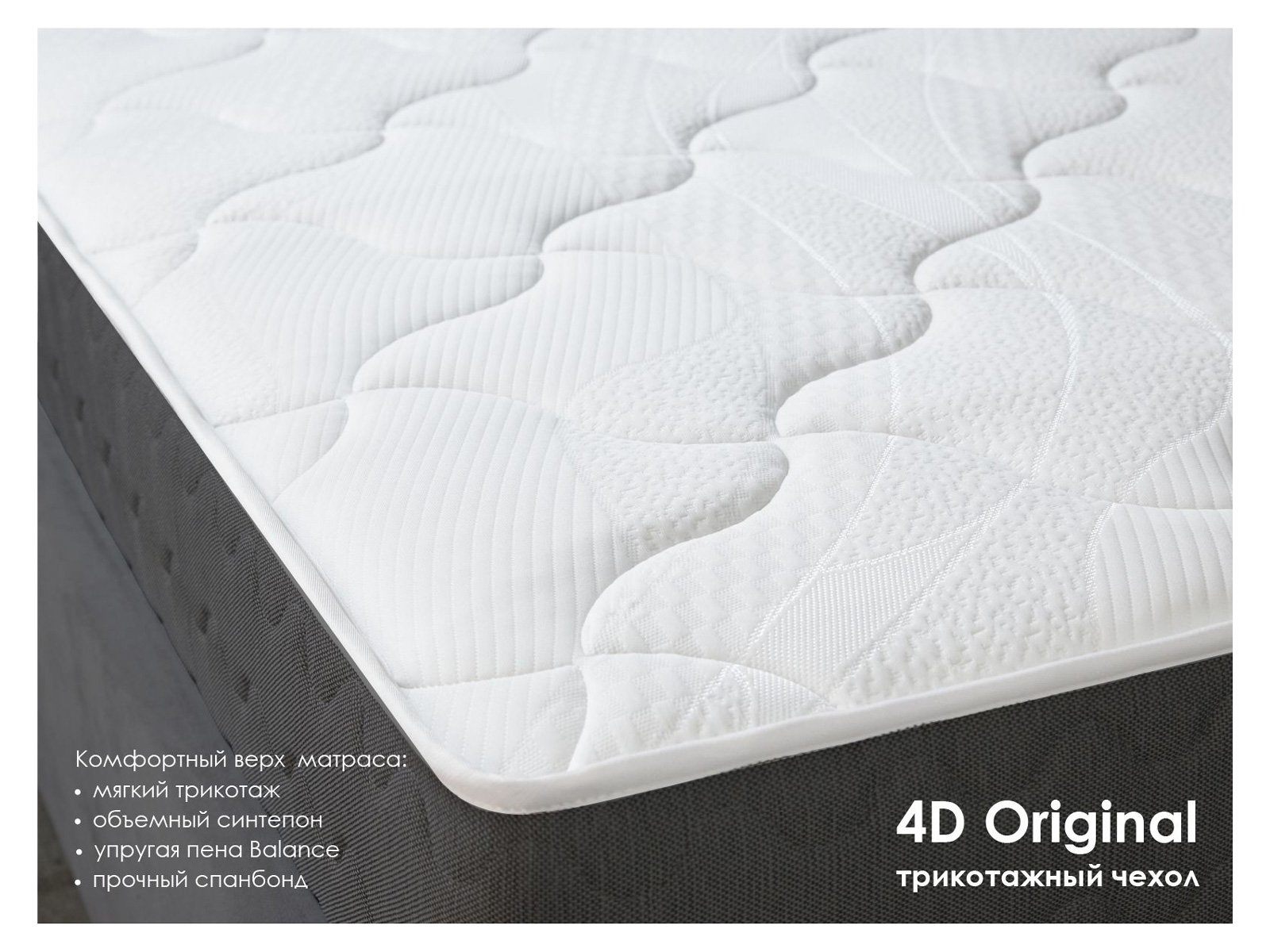 Чехол у матраса выполнен из приятной трикотажной ткани в светло-молочном оттенке. Для стёжки реализован плотный синтепон в союзе с пеной Balance. Наполнители смягчают поверхности матраса и делают их ещё более комфортными. Прочный спанбонд выступает фиксирующим слоем, который усиливает конструкцию обивки. Все слои формируют 4D Original – четырёхслойную обивку повышенного комфорта.