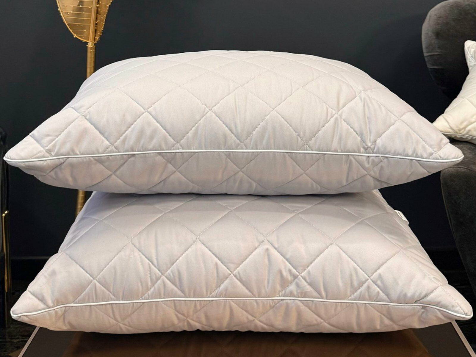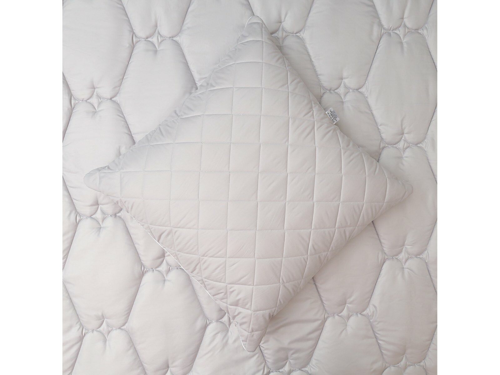 Наполнителем для подушек служит искусственный лебяжий пух, он обладает отличной формоустойчивостью, не сбивается в комки и прост в уходе. Особенность данной модели - уникальная стежка «ромбы», которая хорошо переносит ежедневную эксплуатацию, без потери своих качеств.