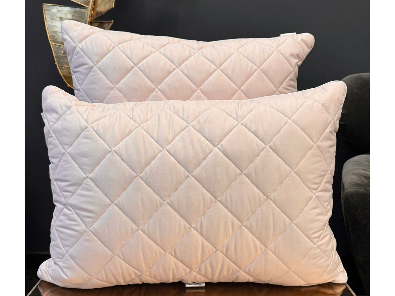 Наполнителем для подушек служит искусственный лебяжий пух, он обладает отличной формоустойчивостью, не сбивается в комки и прост в уходе. Особенность данной модели - уникальная стежка «ромбы», которая хорошо переносит ежедневную эксплуатацию, без потери своих качеств.